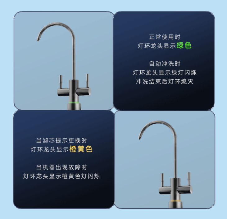 当滤芯提示更换时,灯环龙头显示橙黄色;